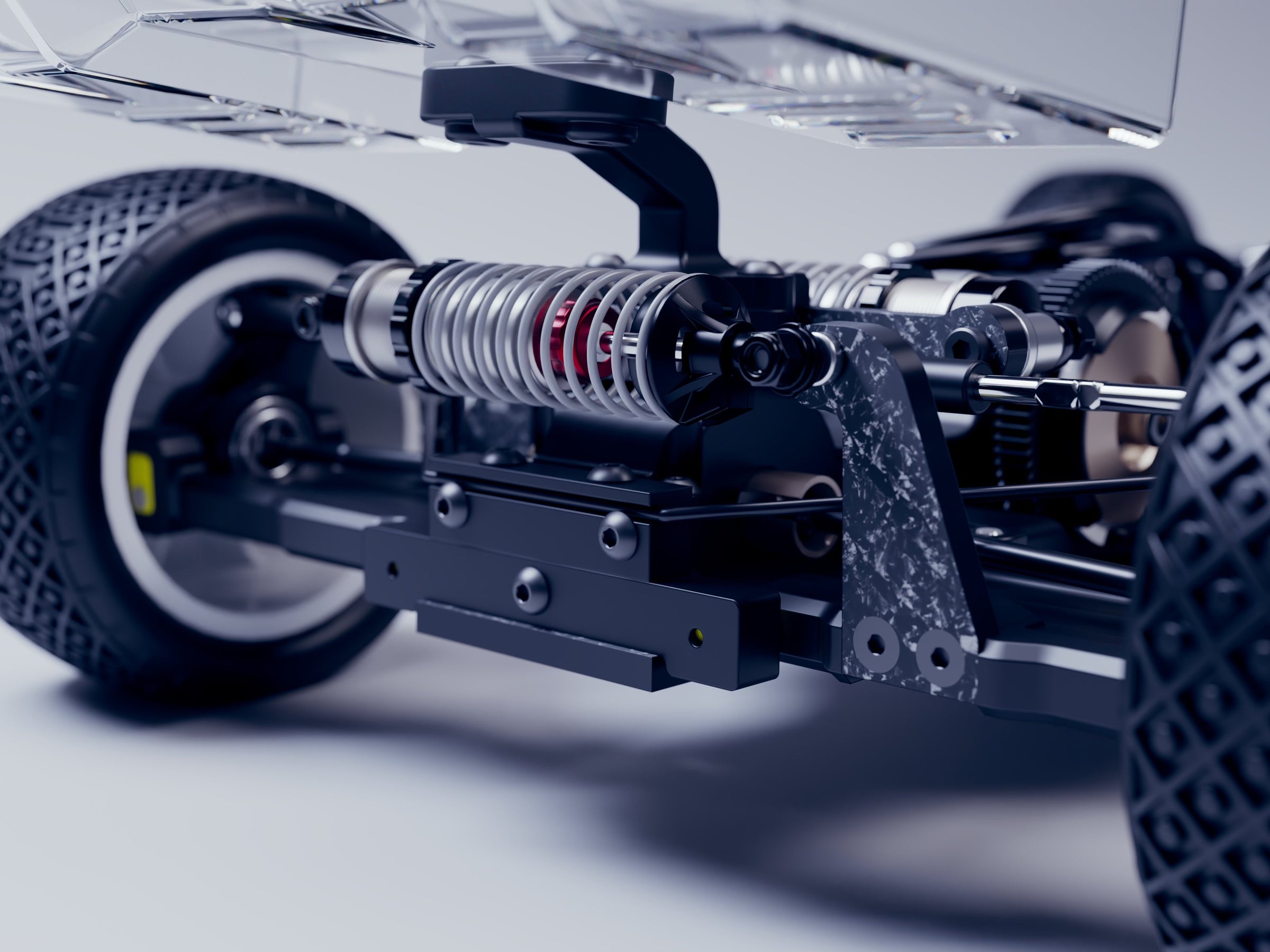 • Forged carbon front & rear suspension mounts
